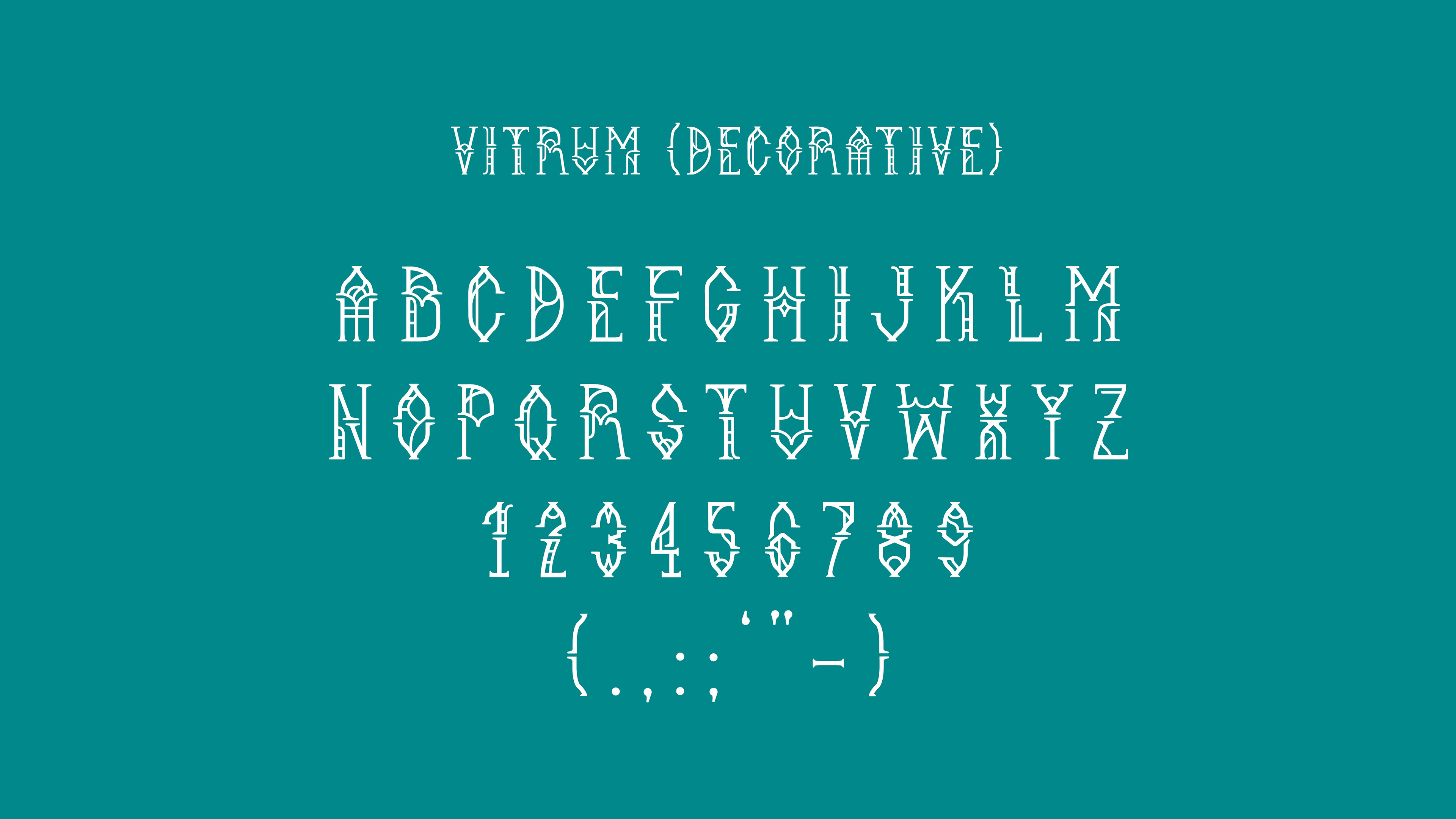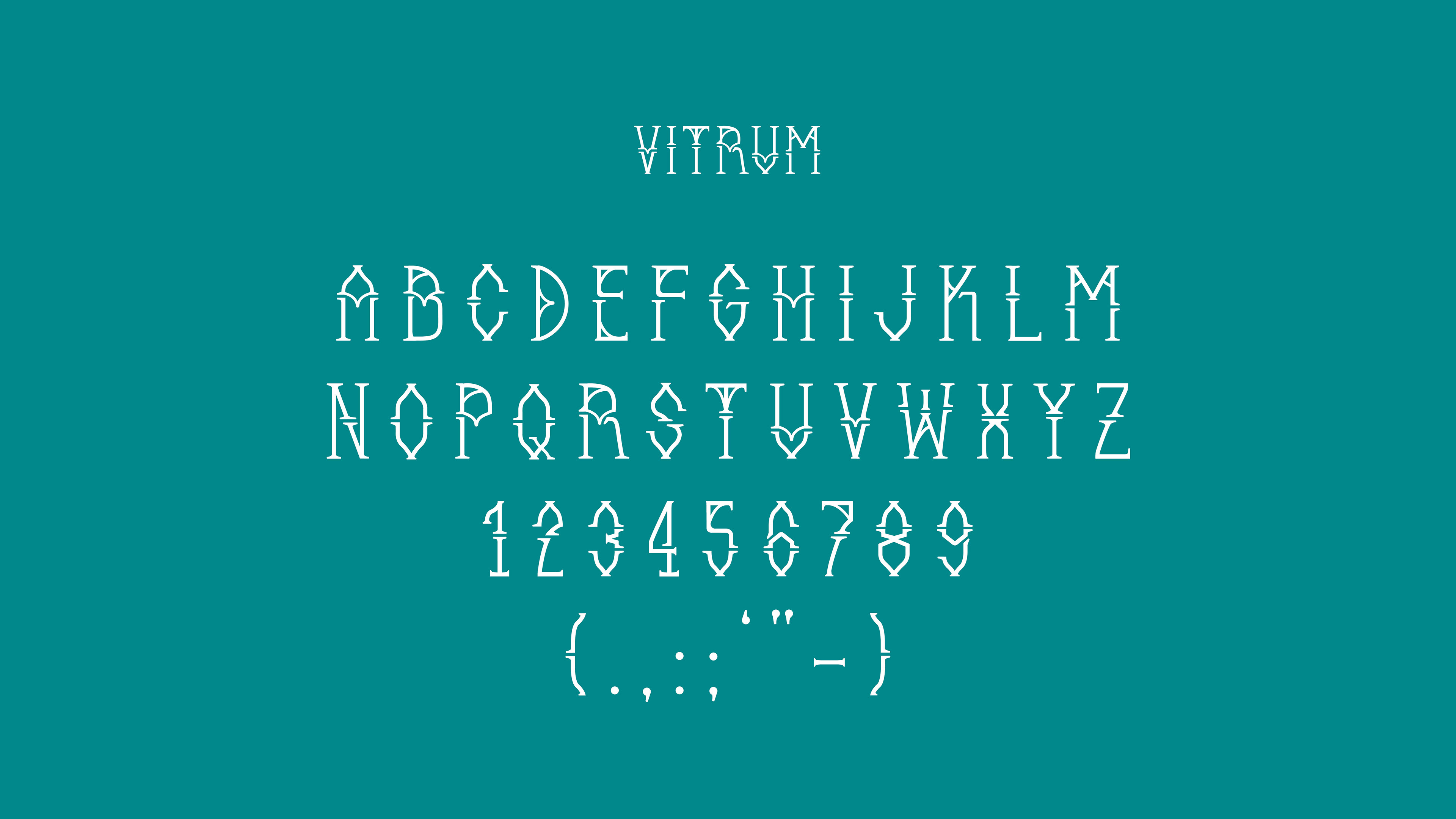 Vitrum is a typeface designed from scratch on Illustrator, the decorative style taking inspiration from stained glass windows and gothic cathedral architecture.